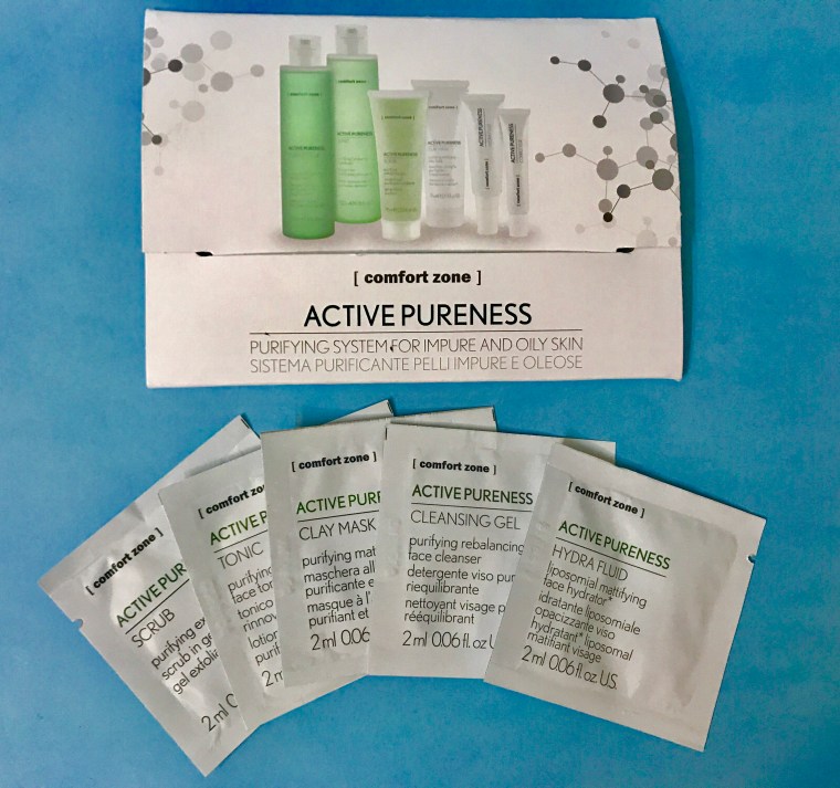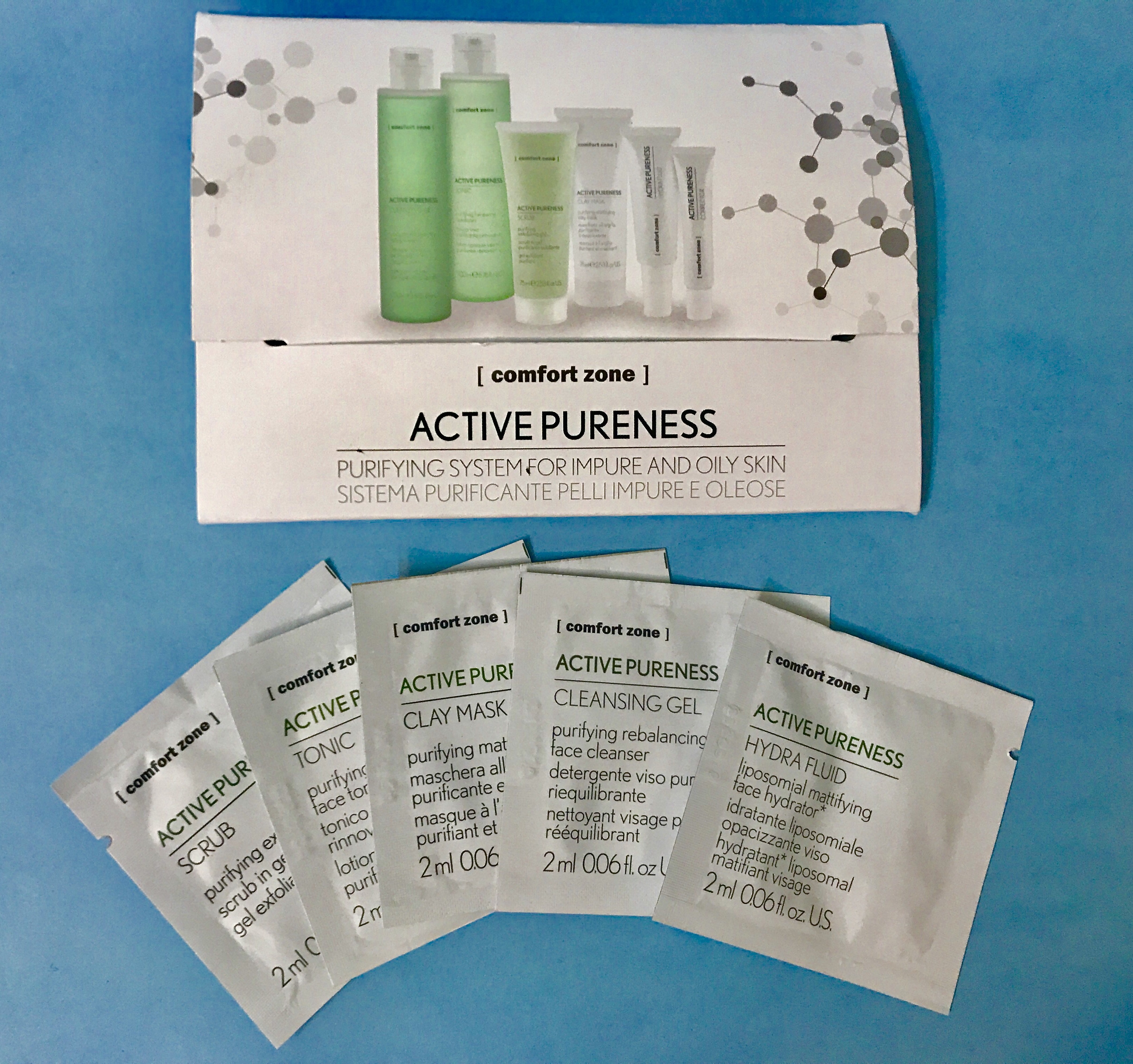 - Comfort Zone Skin Treatments & Pro- Face Kits : Comfort Zone is specialised in skincare products formulated with finest natural origin active ingredients. I received the Active Pureness face kit and It contains the samples from each product from this range that is Cleansing Gel, Tonic, Scrub, Clay Mask, Hydra Fluid. Each satchel is 2 ml.