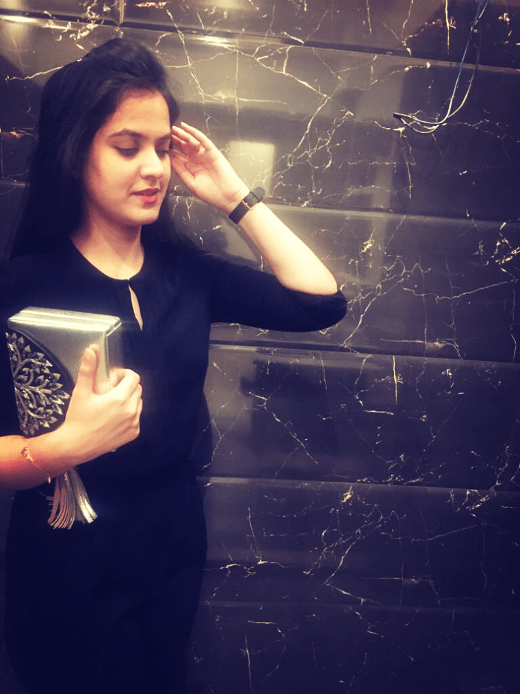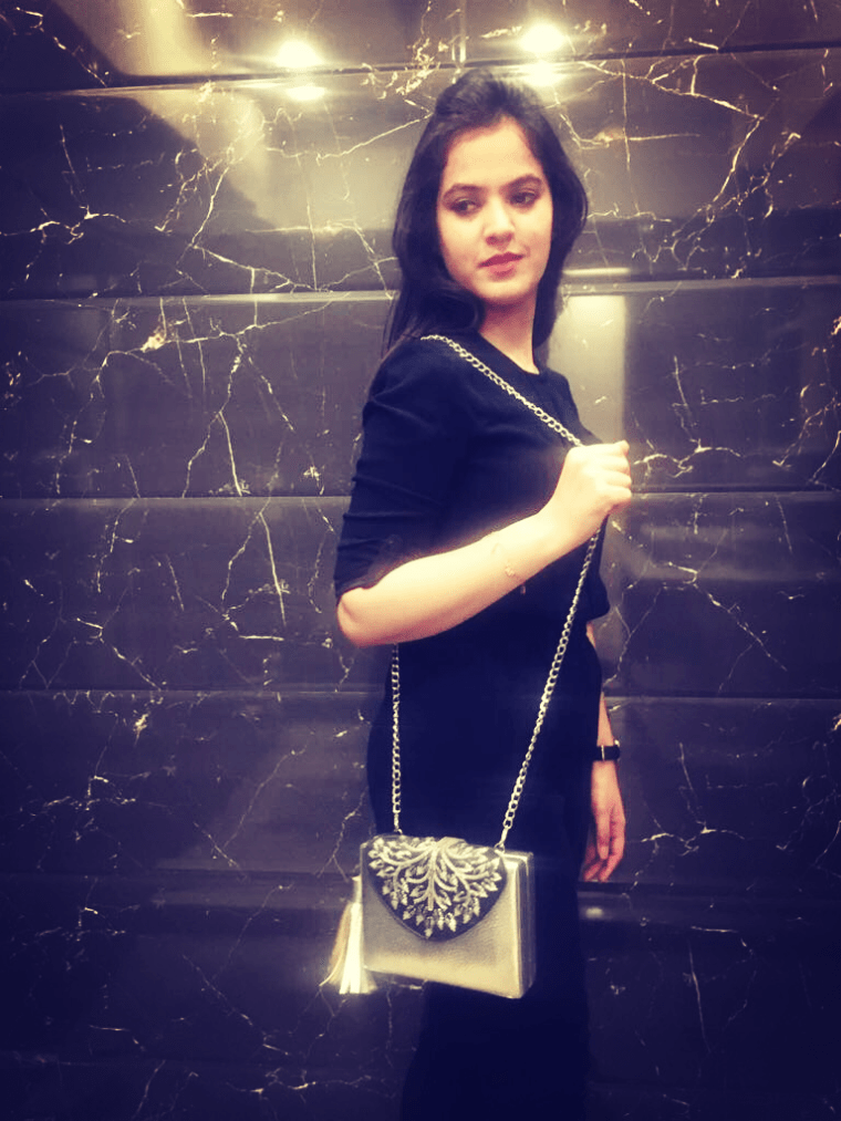 I ordered the clutch by Rossoyuki. It is a silver and black clutch with an elegant work on its flap. It comes up with the chain, to be used as a sling bag. I paired my clutch with a black jumpsuit. It gave a perfect look for any party. The favourite part about this clutch is, it can be paired with western as well as Ethnic outfit. The colour combination is really unique and easy to carry.