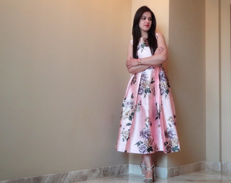 Pink, Red are the two lovely shades you can go for. But there is no such compulsion, the outfit options are unlimited. The only thing that matters is the confidence you feel while carrying your outfit. I am wearing a pink flare dress with the floral prints all over it. After all it’s the time to live your love story all over again.