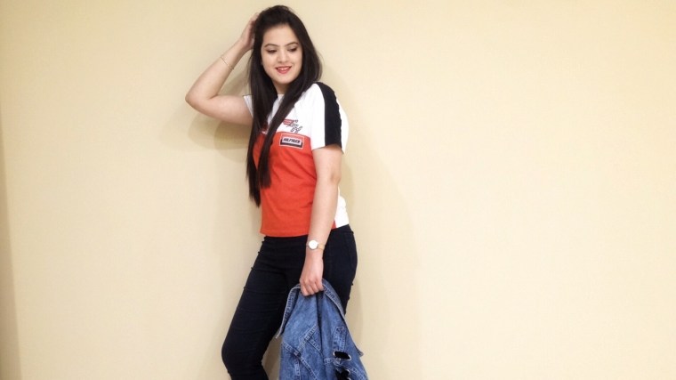 - I teamed up my casual colour block tee with the dark blue jeans and a oversized denim jacket for a perfect street style look. Kept my hair untied, you can even go for a ponytail if you like. Makeup plays a vital role here, I kept my makeup fresh and a red lipstick to match with the border of the tee. A nice watch will be enough to complete the look. I am wearing a chain strap with white dial, you can even go for the silicon strap for more sporty look.
