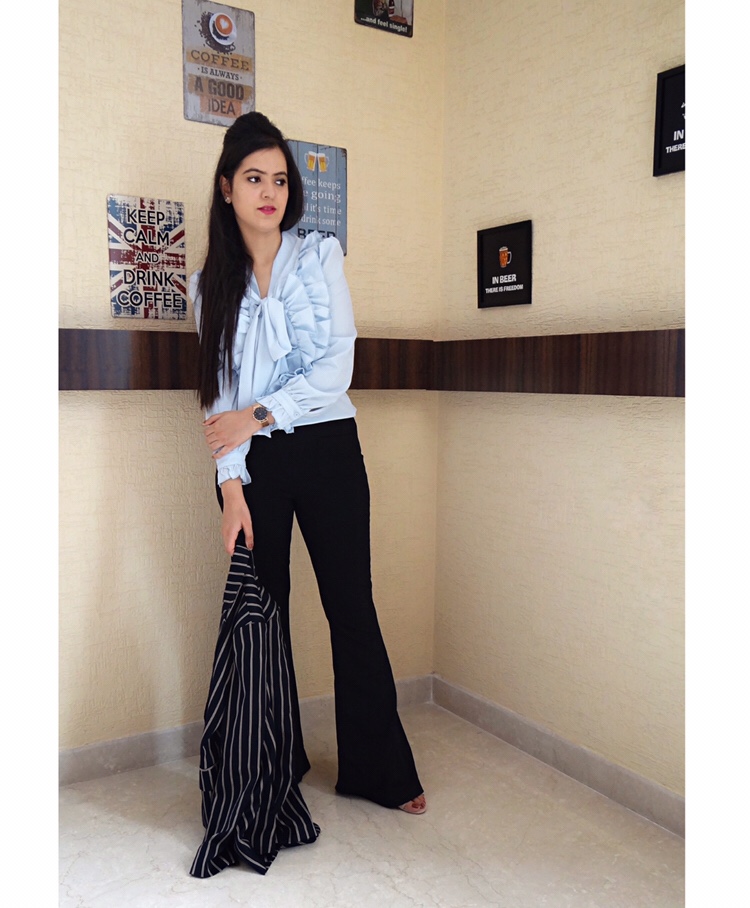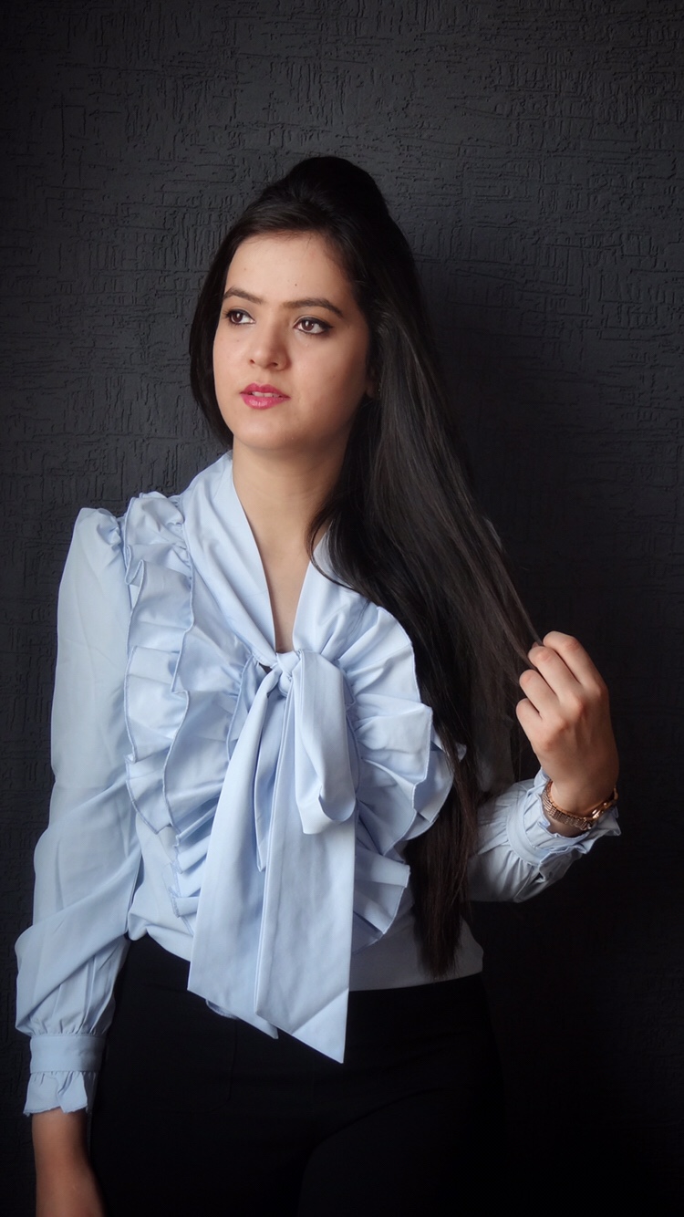 Love your work, but first of all you have to love yourself. Life is not perfect, but your outfit can be. This season is all about vintage trends like Flared jeans, pastels, ruffles. I am wearing an Exaggerate Bow Tie Neck Ruffle Trim Top in the pastel blue shade. I really love the way it stands out. It can be easily paired with any formal trouser or pencil skirt.