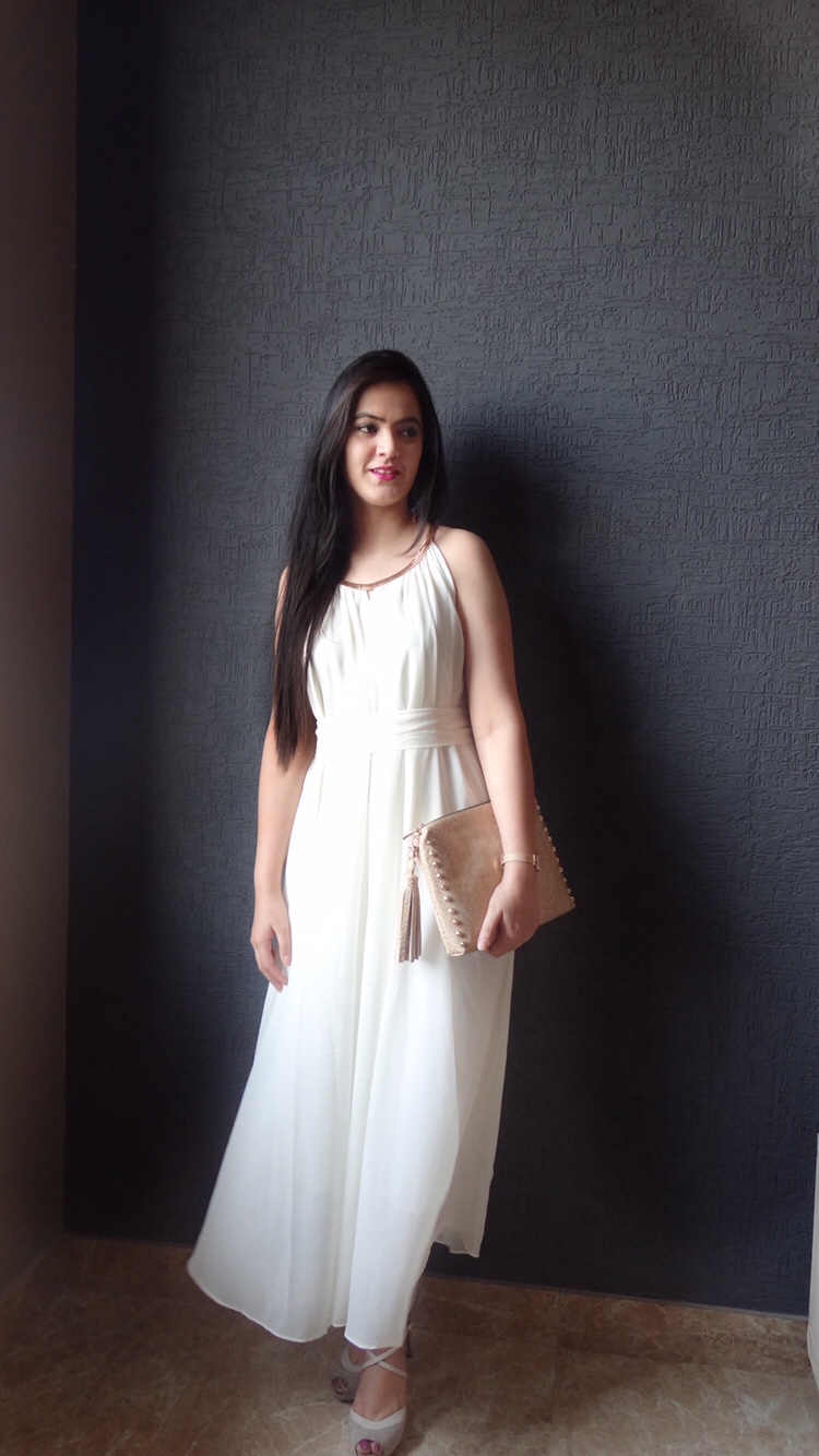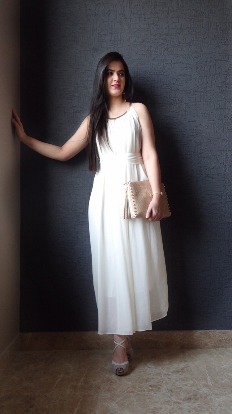 Summer season Lookbook should always be minimal with a bling. Pastels, white and tangerine are the perfect summer colors. I have a special place for white shade in my heart. You can always reuse any white outfit by pairing it up with the denim, shrug or just a stole. Summer goddess look can’t be achieved without a maxi dress, and that too in a snow white shade. The maxi works for almost all of the body types. Whether you are curvy or skinny, tall or short you can always slay a maxi dress and a little bling never hurt. I am wearing a maxi dress with a golden neck line and a belt around the waist.