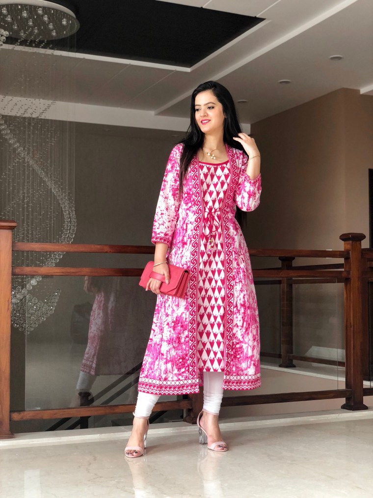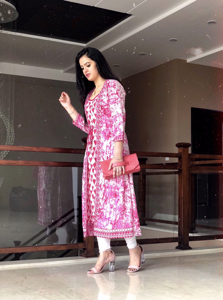 If you like to keep it chic, kurti with ethnic jacket is the best option. Pink has always been my happy colour and it gives major festive vibes. This kurti gives you a jacket look with the front tie that is quite trendy, yet comfortable and light in weight. I paired it up with a hot pink hand strap purse and a blush pink pair of heels to add the sass to the look. I decided to keep my jewellery to minimal and settled for a neckpiece with pearls detailing.