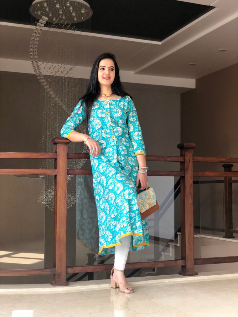 One can never go wrong with an A-Line Kurti. It is super comfortable and trendy. It works for all the occasions and looks good on all the body types. The secret to play with such printed kurti is playing with similar toned print and adding a style factor with a safe shade like nude shade. Whenever you are confused about the right pair of the footwear or accessory, nude shade comes as a saver. I teamed it up with a top handle purse with similar print. Minimal jewelry can complete the look. As, a print of the kurti is doing the trick.