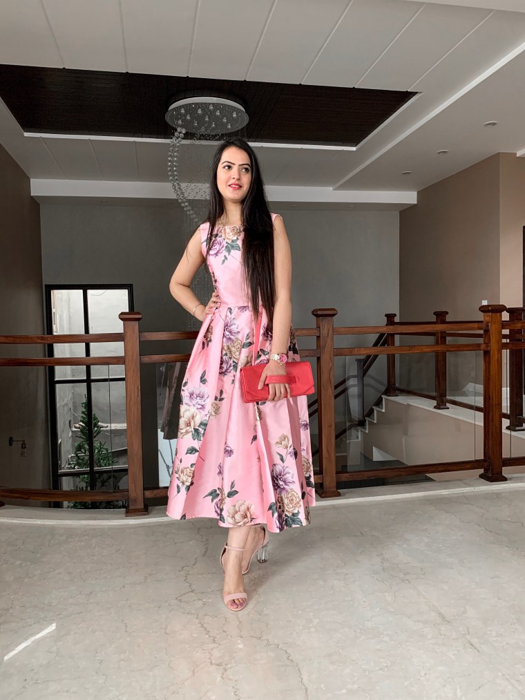 • Classy Chic: If floral and pinks are your thing, then this look is made for you. Wearing a midi length printed floral, flared dress with the nude pink heels. Added a pop of colour with the clutch. And completed my look with a gold watch with a pink dial.