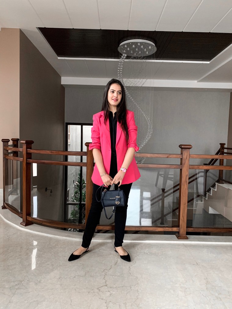 • Boss Babe: If you are a babe who loves to slay the blazers, then this look is just perfect for you. I am wearing a hot pink blazer with the black jumpsuit and paired my outfit with the black pointed flats to keep it comfortable yet classy. I am carrying a top handle mini bag to complete the look.