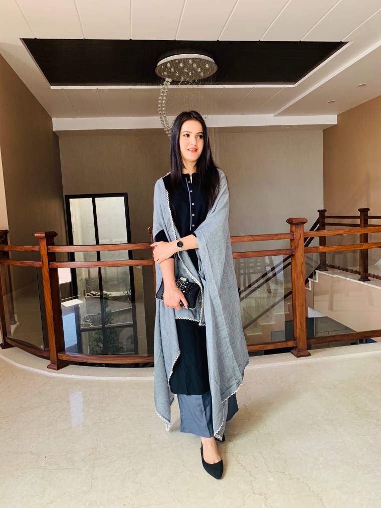 When it comes to the Summer the cotton and viscose are the two most comfortable and ultra-soft fabrics. I found two most comfortable yet chic Kurtas to rock my Summer looks. The first one is my favourite that has two my most favourite shades: black and grey. The simple black Kurta comes with unlimited style options like a printed scarf or an ethnic jacket. I decided to wear the black Kurta with the grey palazzo and a grey jacket. I kept the Jewelry minimal and makeup natural. I finished my look with the pointed toe black flats. This look is perfect for 9-9 look. You can go to work, then just put on the jacket and slay your evening look.